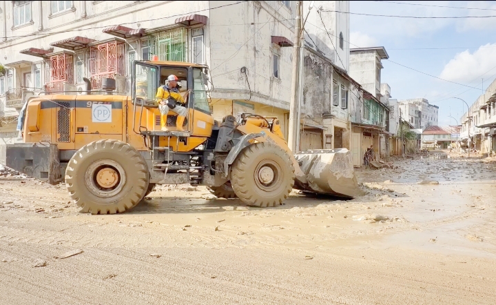 Pantauan di lapangan pada Selasa (23/12) menunjukkan alat berat dengan roda besi intens berlalu-lalang membelah tumpukan lumpur yang cukup tebal. Meski deretan ruko dan rumah warga masih tampak sepi karena sebagian besar bangunan masih tergenang sisa pembersihan, geliat mobilitas warga sudah mulai terlihat.