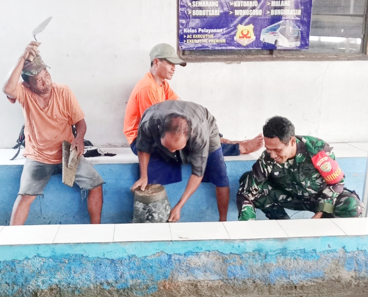Babinsa Desa Salira, Serka Suryanto, melaksanakan Karbak dengan membantu pemasangan keramik di rumah warga di Kampung Sintong RT 02/03.
