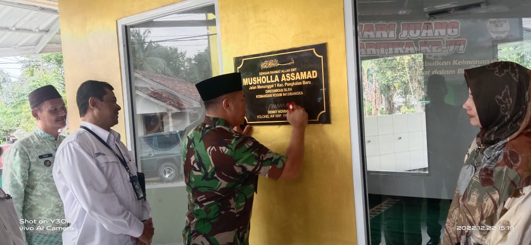 Poltamnews.com||BANGKA TENGAH –Bertepatan Hari Juang Kartika Ke-77 yang jatuh pada tanggal 15 Desember 2022, Kantor Koramil 413/09 Pangkalan Baru Kabupaten Bangka Tengah Provinsi Kepulauan Bangka Belitung hari menggelar acara peresmian Musholla Assamad, Kamis (22/12/2022).
