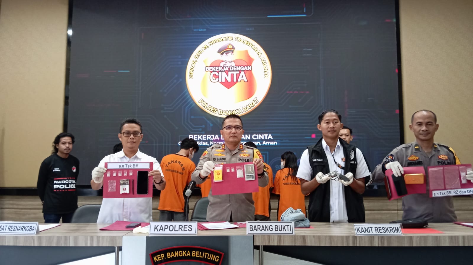 Kapolres Bangka Barat AKBP Ade Zamrah SIK menjelaskan uraian singkat kejadian”Pada hari Senin tanggal 01 Januari 2024 sekira pukul 19.00 WIB (MMR) berkata”ku ni nak ngambik barang(narkotika jenis sabu sabu) tapi duit ku ni kurang baru Ade,Rp.500.000 (lima ratus ribu rupiah) lalu (RZM) jawab”wadau bang dak pacak bang,nak cash lah bang”lalu (MMR) berkata”macem ni bae pon ku Ade duit Rp.500.000 kek senpi ku ni kau pegang kelak ku bawak agik” kemudian (RZM) mengiyakan nya.