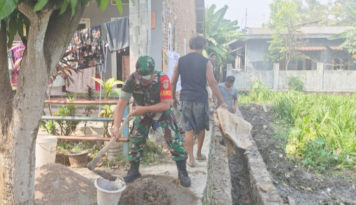 Sertu Sunardi, Babinsa Kelurahan Kepuh, melaksanakan kegiatan Karbak bersama masyarakat dalam bentuk gotong royong pembangunan rumah warga.