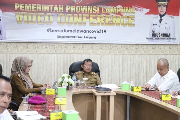 Pemerintah Provinsi Lampung diwakili oleh Asisten Perekonomian dan Pembangunan, Kusnardi, mengikuti Rapat Koordinasi Pengendalian Inflasi Daerah (Virtual) yang dipimpin langsung Menteri Dalam Negeri, Tito Karnavian, di Ruang Command Center Lt.II Dinas Kominfotik Provinsi Lampung, Senin (15/5/2023).