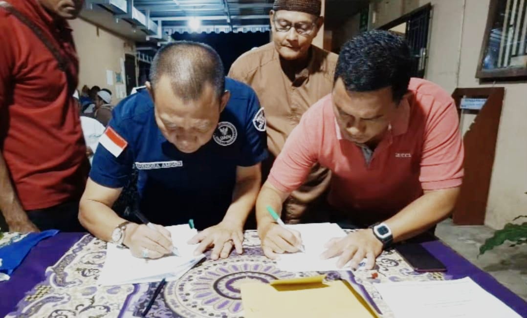 Kepala Desa Bikang, Zulfani, menyerahkan Berita Acara Serah Terima Hibah dan Surat Pernyataan Pengakuan Penguasaan Atas Tanah (SP3AT) kepada Kepala BNNK Basel, Hendra Amoer, disaksikan langsung oleh peserta rapat.