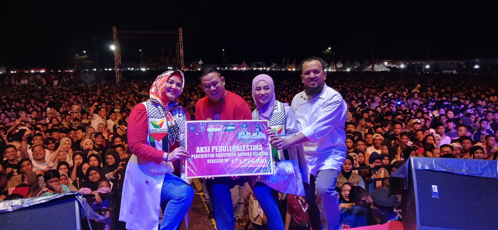 Penyerahan tersebut, digelar pada malam puncak Festival Pesona UMKM yang bertajuk UMKM Fire 2023. Donasi ini diberikan langsung oleh Bupati Bangka Selatan Riza Herdavid, bersama Wakil Bupati Bangka Selatan, Debby Vita Dewi, dan Forkopimda Bangka Selatan kepada para relawan peduli aksi palestina, Nabila Ayu Eks JKT-48, di Sport Center, Junjung Besaoh Pemkab Basel, Kamis (30/11/2023) malam.