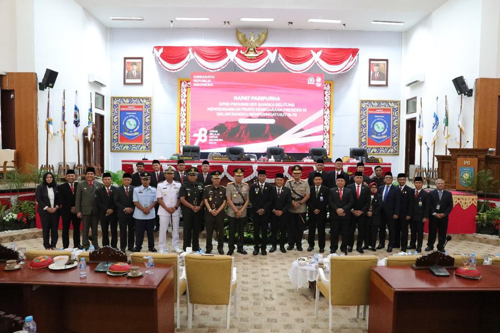 Setelah dibuka oleh Ketua DPRD Babel Herman Suhadi, Rapat Paripurna tersebut kemudian dilanjutkan dengan agenda mendengarkan pidato kenegaraan Presiden RI Joko Widodo pada Sidang Tahunan MPR yang pada tahun ini mengenakan pakaian adat Tanimbar Maluku.
