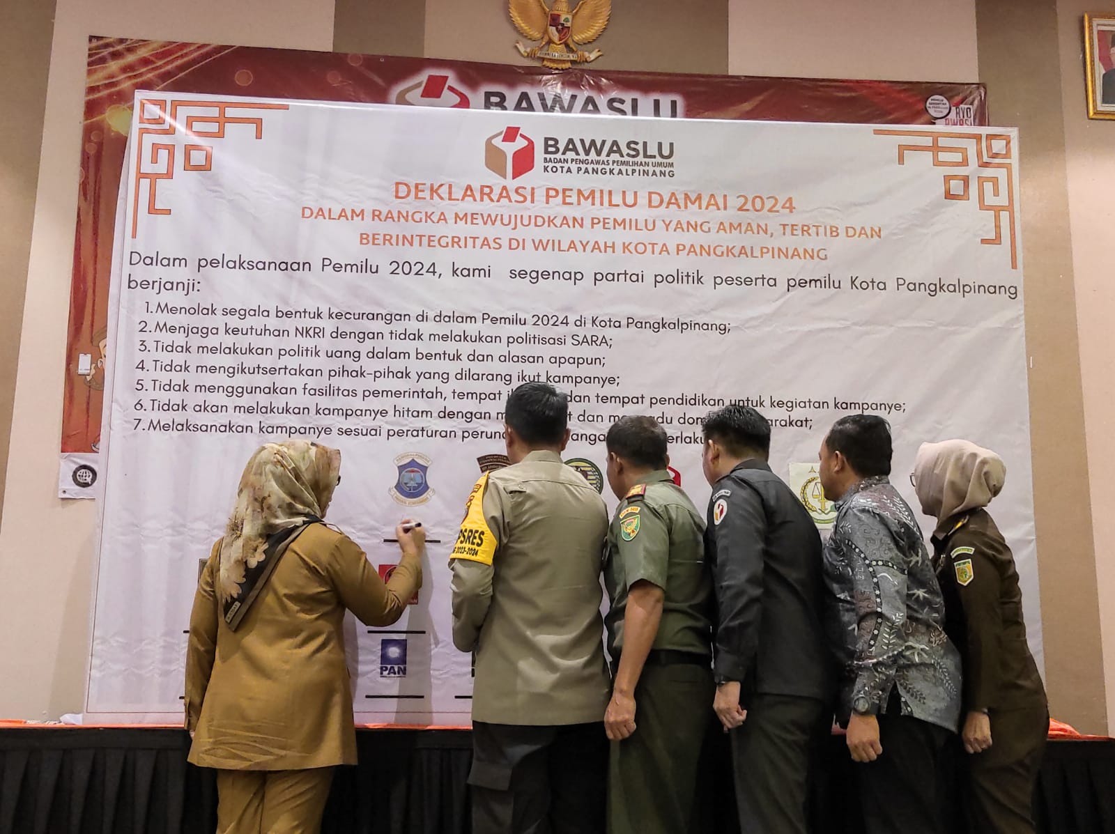Poltamnews.com|Pangkalpinang – Penjabat (Pj) Wali Kota Pangkalpinang, Lusje Anne Tabalujan melakukan penandatanganan deklarasi pemilu damai antara Bawaslu Kota Pangkalpinang, KPU Kota Pangkalpinang dan partai politik peserta pemilu tahun 2024, di Grand Safran Hotel Kota Pangkalpinang, Selasa (21/11/2023).