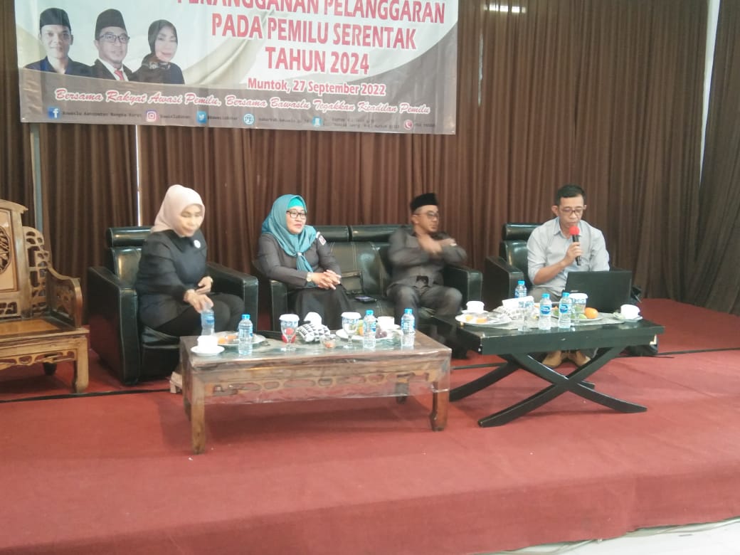 Fasilitasi Pembinaan Penanganan Pelanggaran pada Pemilu Serentak Tahun 2024, di ruang rapat Koperasi Warga Peltim di Kecamatan Muntok, Selasa ( 27/9/2022 ) siang.