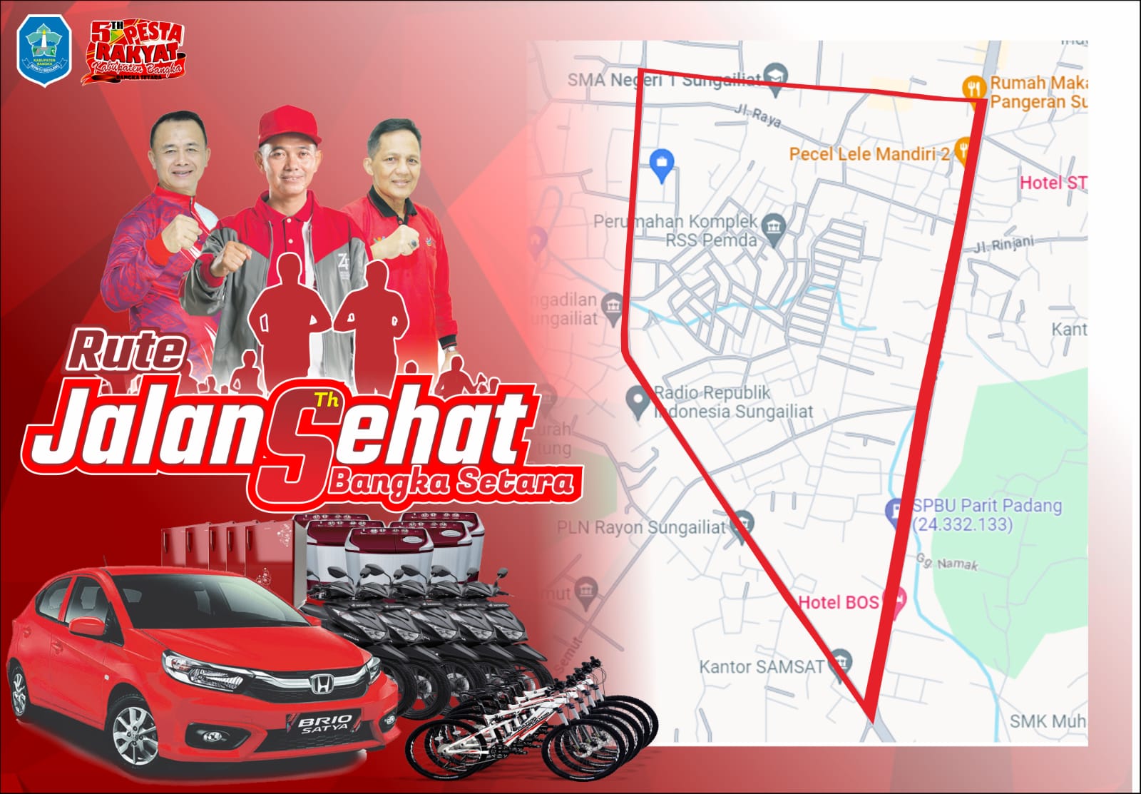 “Pemerintah Kabupaten Bangka mengadakan jalan sehat berhadiah mobil yang dipersembahkan Honda Niaga Bangka dan motor Honda persembahan Honda Babel. Sekitar 20 ribu warga akan mengikuti jalan sehat yang akan menempuh rute start depan kantor Bupati, gedung juang, parit padang, jalan Pemuda dan finish di halaman kantor Bupati Bangka,”ungkap Derika Buliana, Panitia jalan sehat.