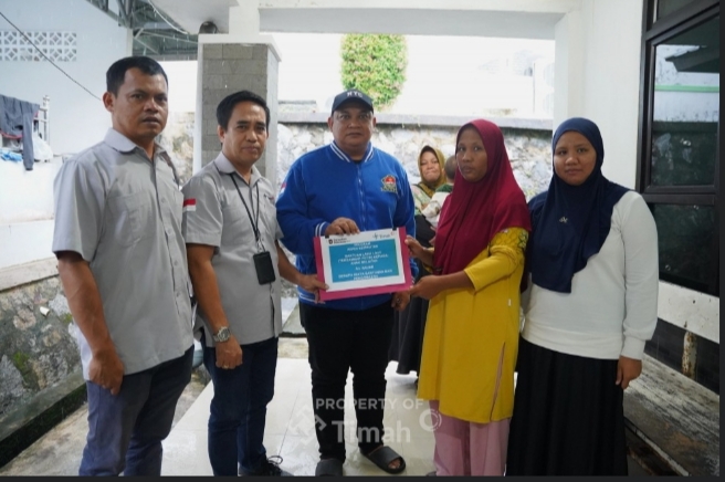 Bantuan dari PT TIMAH Tbk ini diserahkan langsung oleh Departement Head TJSL PT TIMAH Tbk, Risal Barung Mangontan kepada Winda (37) Ibu Baharudin yang turut disaksikan Ketua DPC HNSI Kabupaten Bangka, Slamet Riyadi, Rabu (10/12/2025),