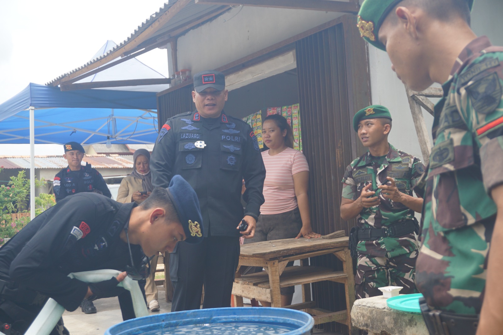 Kades Air Mesu turut mengatur warga yang hendak mengisi air. Wadan Yon A Pelopor AKP David Charlie beserta anggota langsung membagikan air kepada masyarakat sampai tercukupi.