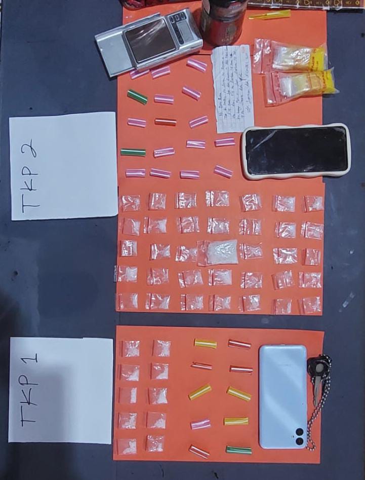 Dari hasil penggeledahan terhadap kedua pelaku, kata AKP Harry Frizko, polisi sukses mendapatkan barang bukti berupa 44 (empat puluh empat) buah plastik klip bening berukuran kecil berisikan kristal putih, yang diduga narkotika jenis sabu dan 1 (satu) buah plastik klip bening, berukuran sedang berisikan kristal putih yang diduga narkotika jenis sabu seberat 23,19 gram