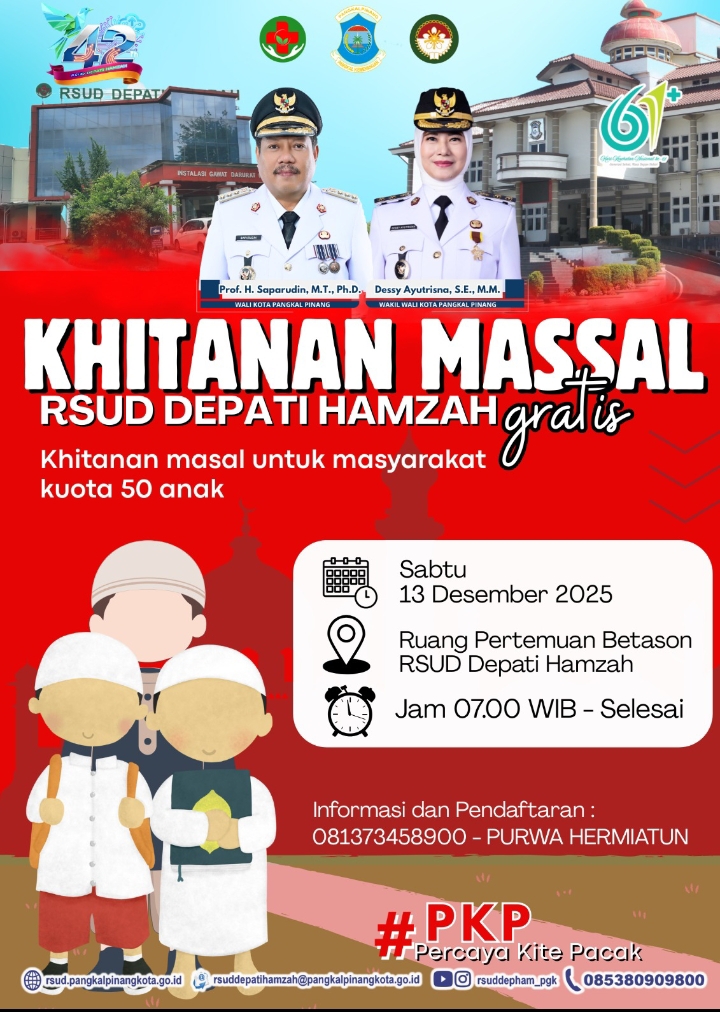 Poltamnews.com | Pangkalpinang – Dalam rangka kegiatan sunatan massal yang diselenggarakan di Rumah Sakit Umum Daerah (RSUD) Kota Pangkalpinang, yang nantinya akan diselenggarakan pada tanggal 13 Desember 2025. Dan dimulai dari pukul 07.00 WIB sampai dengan selesai.